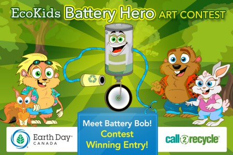 Special Note: Battery Bob was designed by Demetrios A., a grade 6 student at Montreal’s School. He won the 2015 “Battery Hero Contest” with his original drawing of Battery Bob: the prize included a guest star role in an episode of Paddy The Beaver! The Battery Hero storyline and contest was a new initiative by Call2Recycle in conjunction with Earth Day Canada’s EcoKids environmental education program to promote the recycling of batteries.